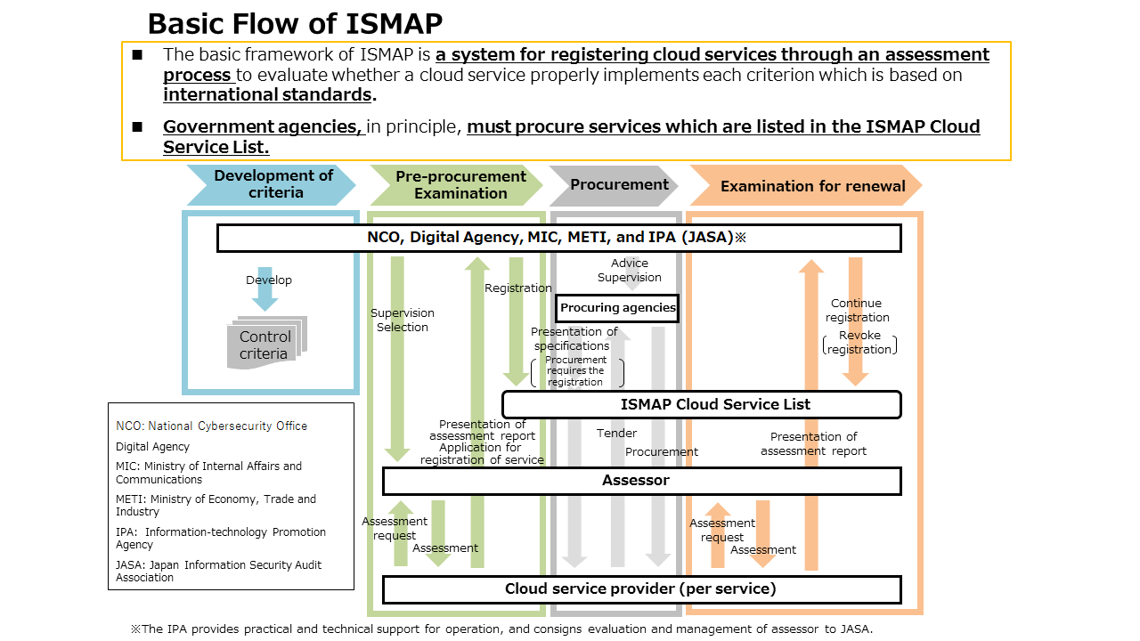 The Information system Security Management and Assessment Program (ISMAP) aims to secure the security level of the government's cloud service procurement by evaluating and registering cloud services that meet the security requirements of the government in advance, thereby contributing to the smooth introduction of cloud services.